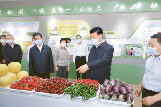 2020年6月8日至10日,中共中央总书记、国家主席、中央军委主席总书记在宁夏考察。这是6月9日下午,总书记在银川市贺兰县稻渔空间乡村生态观光园,了解宁夏现代农业发展和特色农产品情况。 新华社记者 鞠鹏/摄